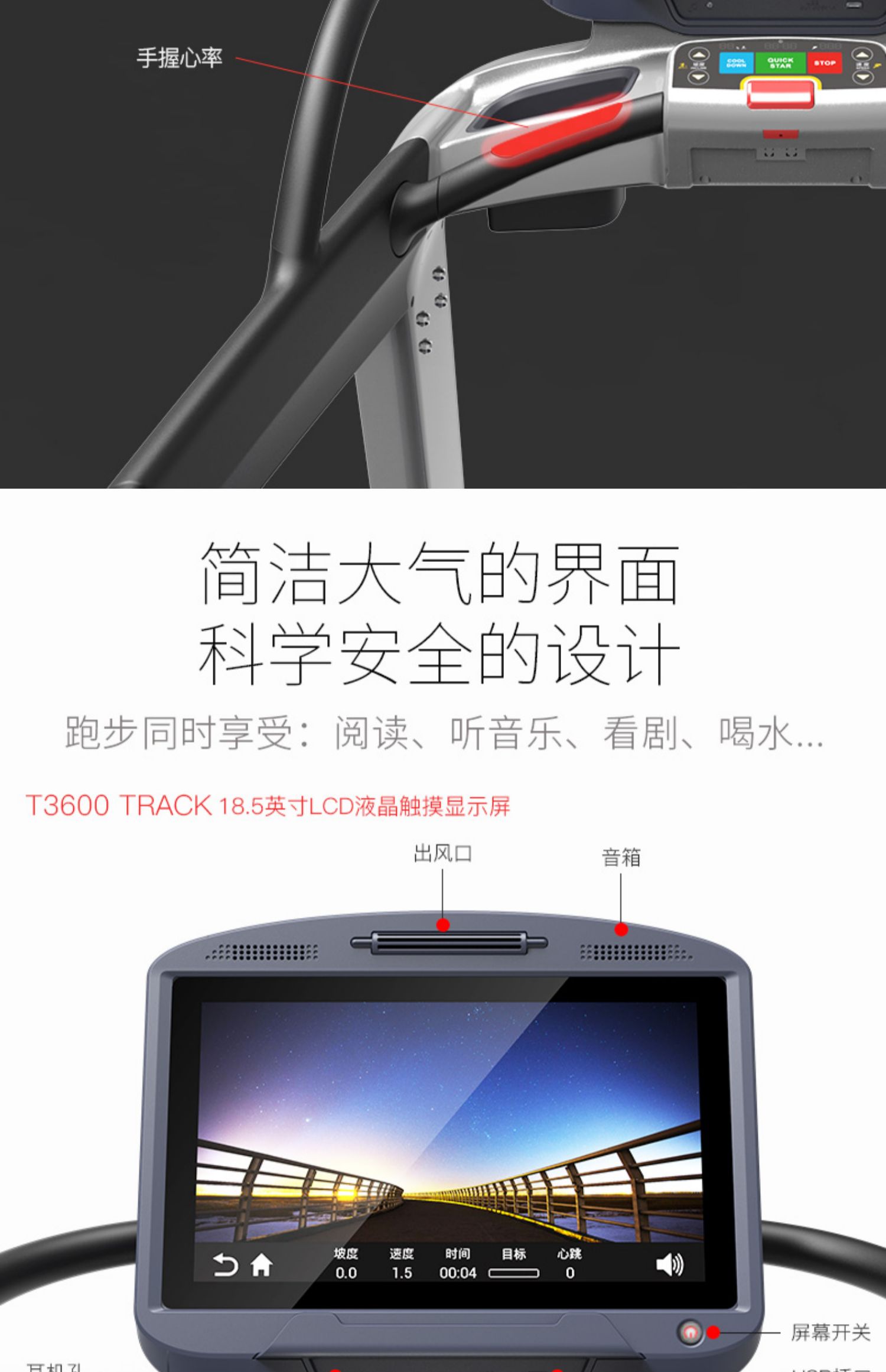 跑步机T3600TRACK(ECO)【触摸彩屏】|7HP峰值马达|58.5cm超宽跑带