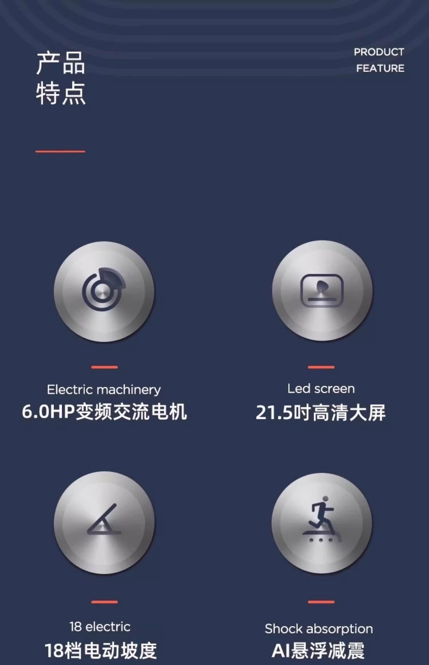 21.5英寸彩屏/6.0HP峰值交流变频电机/电动坡度/60CM跑带