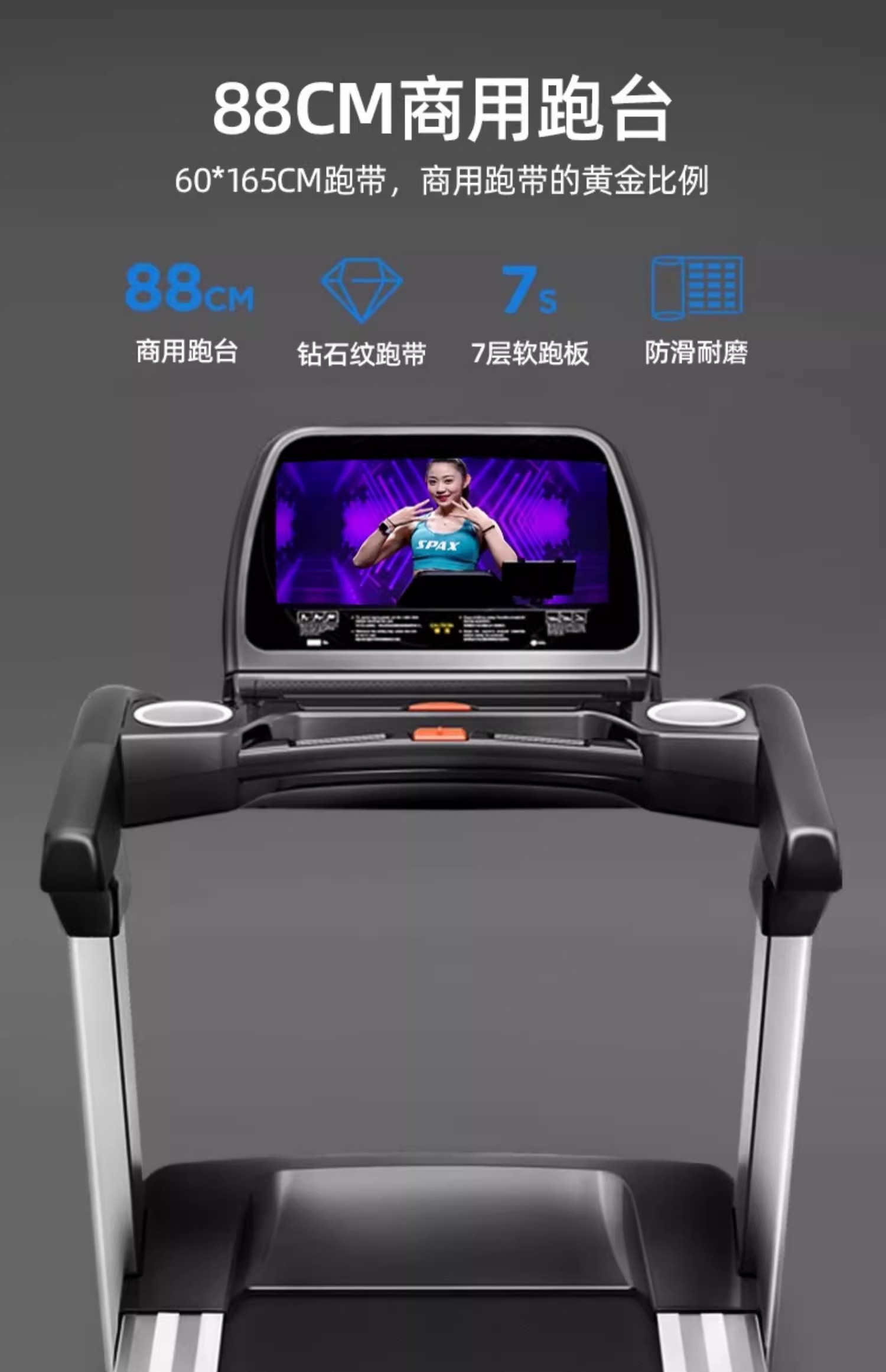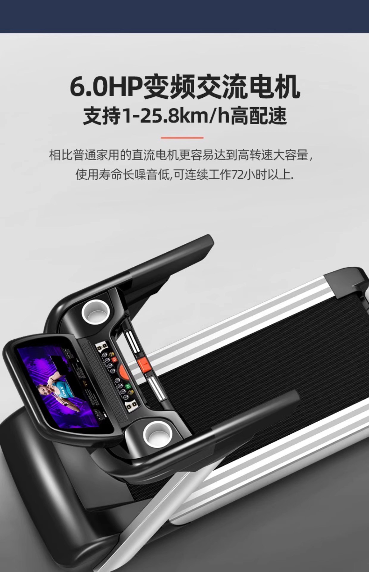 7英寸蓝屏/6.0HP峰值交流变频电机/电动坡度/60CM跑带