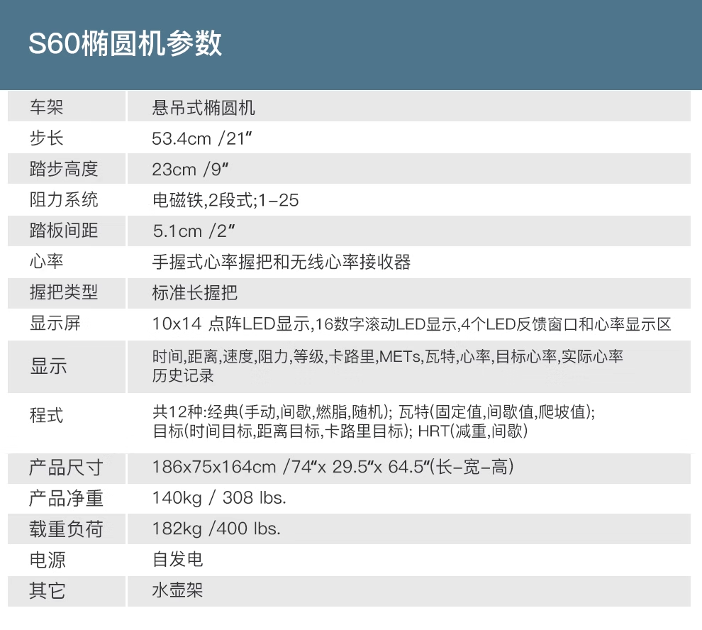 商品名称:乔山椭圆机S60自发电悬挂式登山漫步机静音高端健身房专用器材